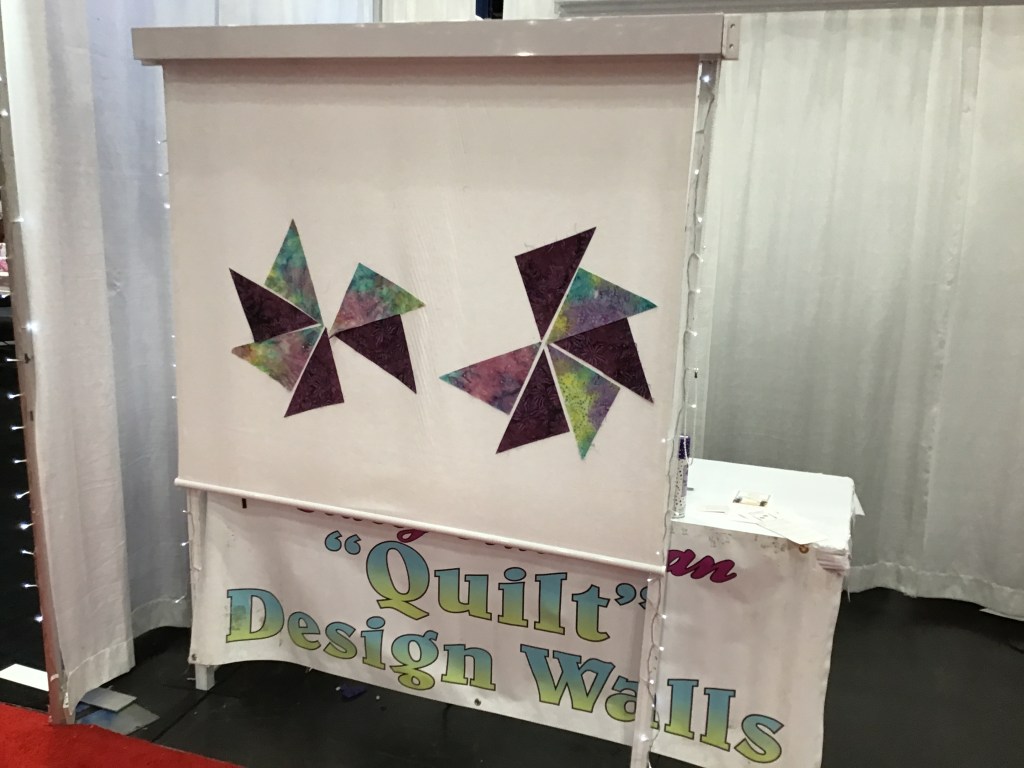 I met the owner, Tony, when he asked if I could watch his booth for a couple minutes. Of course I did and I had the fun opportunity to play with the Quilt Design Walls. I must say that this is now sew totally on my quilter’s wish list! The smaller one (in the photo above) is big enough for a long throw quilt, but my dream is the really big one because — gasp — it has a remote control! AND I LOVE GADGETS! LOL! The small one would be great, too, as it goes up and down easily just like your window blinds. I tested it out, of course, and discovered that if you were careful putting it up and down that your quilt blocks could actually stay stuck to the design wall. Brilliant!