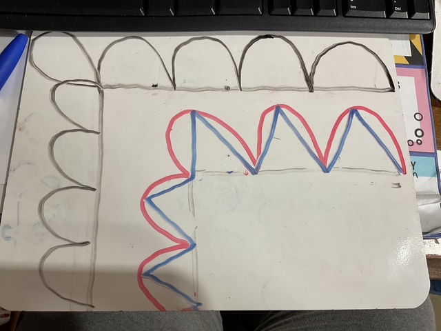 Now let’s look at some variations of the Zig Zag border design. The following designs were created by quilting the border once and then going back and adding a second layer of quilting. The red line is the first quilting line and the blue line is the second quilting line in my doodles below.