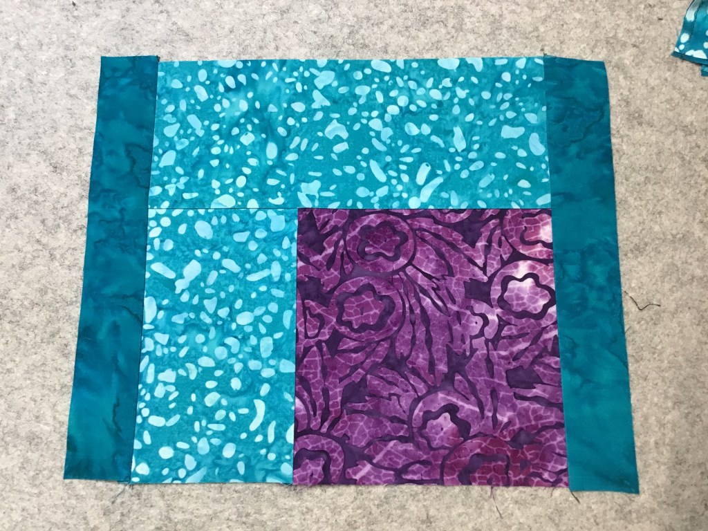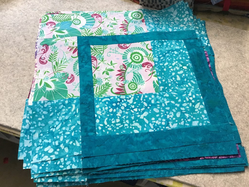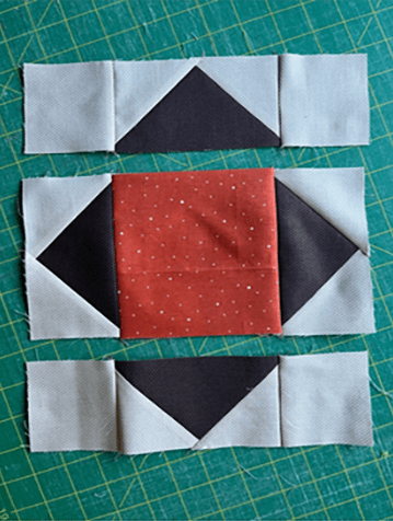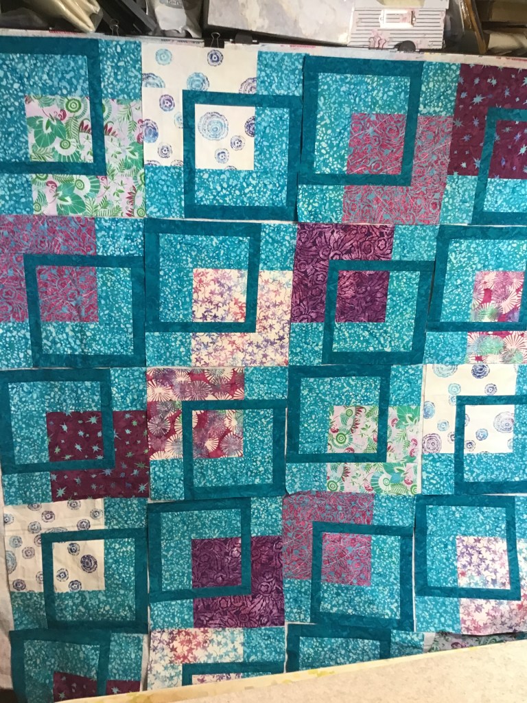 Okay, I’m happy with the blocks and outer squares layout, so I’m going to sew my blocks into rows and then sew the rows together.