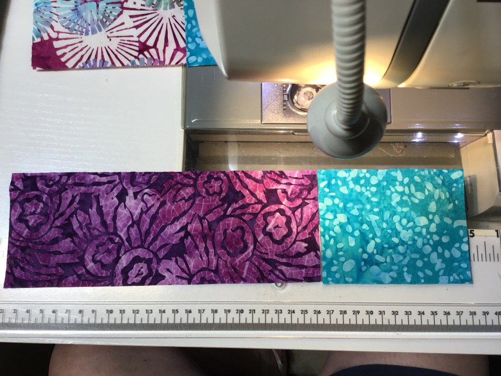 We’re going to sew 2 assorted fat rectangles together to make Block 1. I divided them equally into 2 piles and set them to the left of my machine so I could just grab the 2 top rectangles and feed them through the machine to chain piece them. If I didn’t like the combination or had 2 of the same on top, I just grabbed another one off one of the piles. Sew simple.
