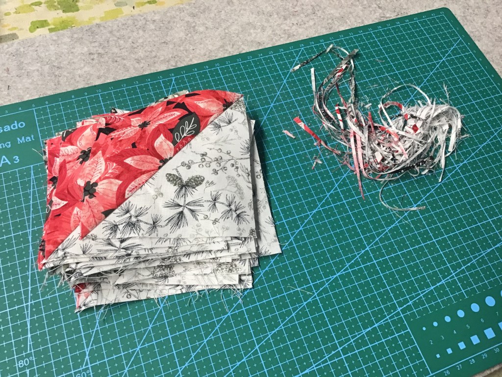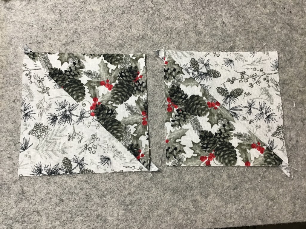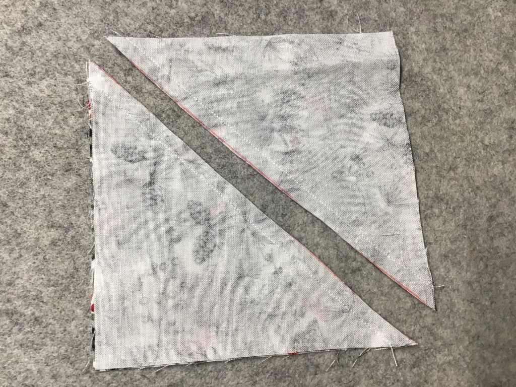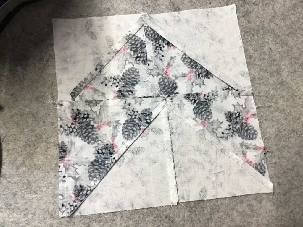 Tip from Heidi (who’s keeping an eye on me as I work on this tutorial) – Press half the seams of each color HST to the background and the other half to the color.