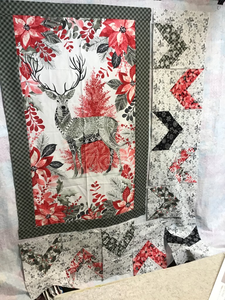 Lay out the main print/panel C pieces and the Flying Geese Block A’s so the Geese are flying away from the center. Sew together (please note that I added an extra background strip to the top and bottom of my quilt. Feel free to do the same, but you will need a little bit more background fabric).