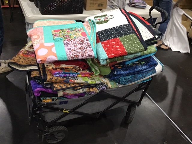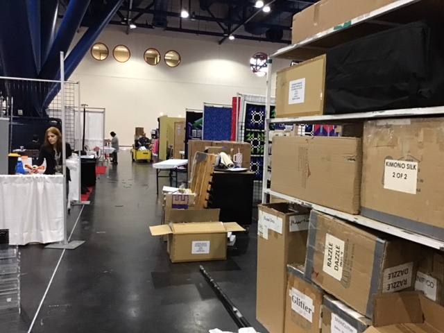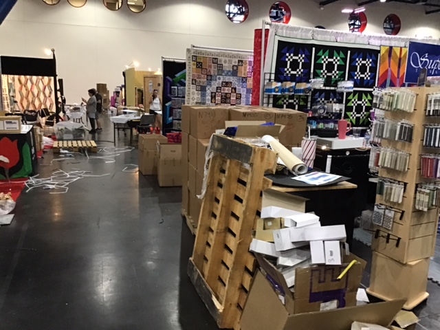 We headed to the Conference Center the next morning on Friday to get the booth set up for Quilt Market. This is definitely no easy task, let me tell you! First, you have to get everything inside so you can set up your booth. Luckily Pat had spent Thursday doing just that so we didn’t have to move much inside. Secondly, you have to navigate around all the other vendors’ stuff sitting in the aisles as they are also setting up their booths. Let me show you some photos of set up. Don’t forget the loaders and equipment, the trolleys and carts….