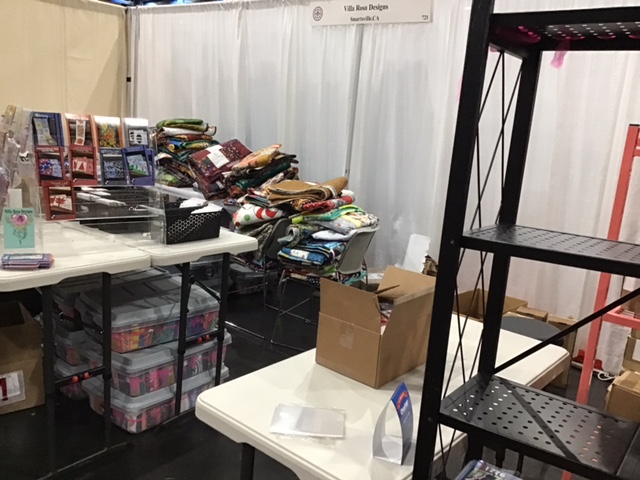 And here’s our VRD booth in the beginning stages. We had a Schoolhouse session at 1:55 PM, so we couldn’t do much with the quilts until afterwards. Schoolhouse sessions are basically mini break out lectures where vendors can share their current and upcoming products and programs.