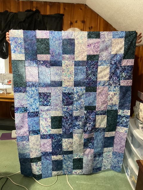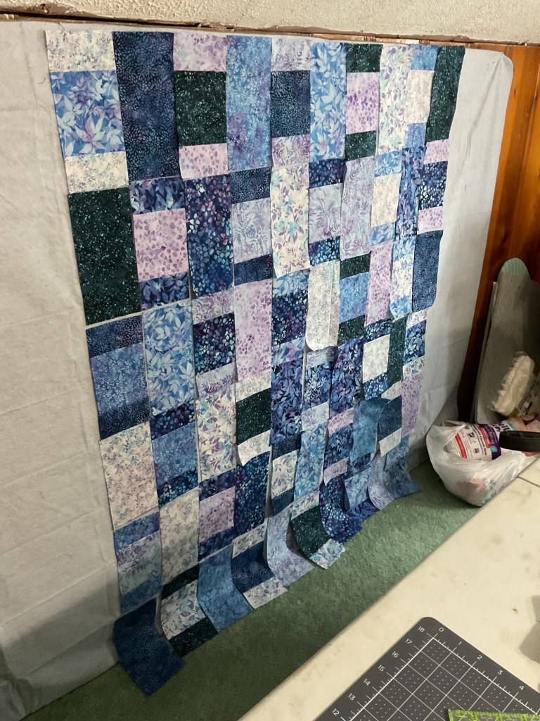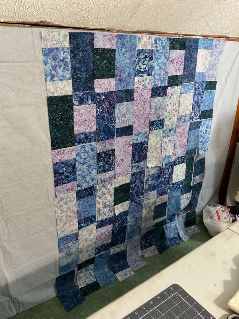 Next we are going to sew the blocks into rows and then sew the rows together to make the quilt top. Oops, this quilt is longer than my flannel wall, so I can’t show you the entire top yet. I told you it was a good sized quilt!