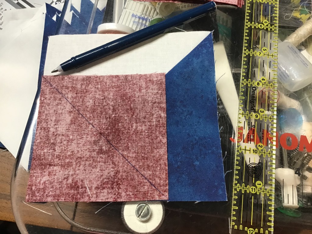 Step 5 Draw a diagonal line from the left edge to the bottom edge, while ignoring the print square on sticking out on the other side. Then open the unit and press. You will have a weird looking unit somewhat like the one in my photo, but your Star points might look different than mine because we probably started and stopped in different places along the edges.
