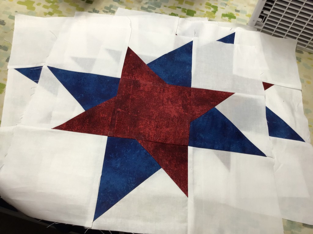 Step 10 Now it’s time to sew your Crazy Star block together like a Nine Patch. You will need 4 Star point units, 4 background squares for the corners, and a center print square.