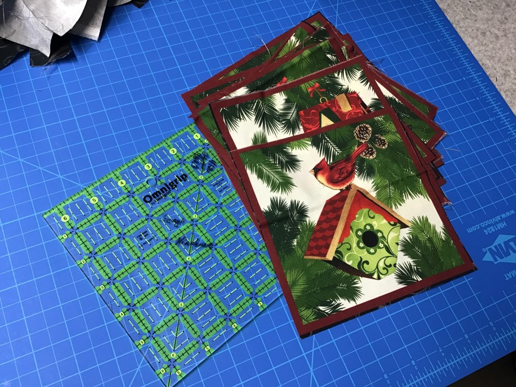 Now that I’m happy with how the blocks look, we’re going to add a border of squares all the way around the blocks. Huh! Bet you were wondering what we were going to do with all those squares (besides add them to our 5″ square stash).