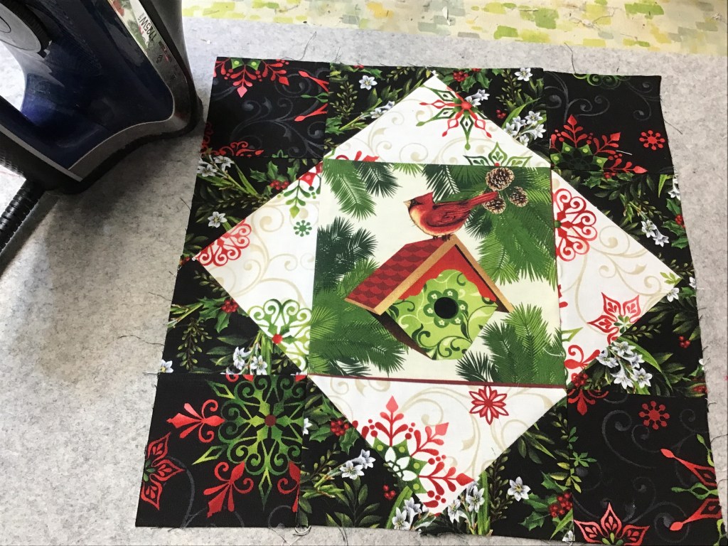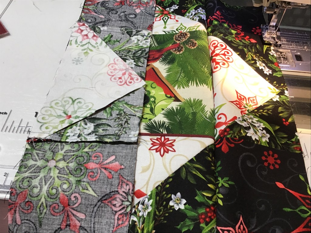 Moving on……..time to sew my squares into rows and then I’ll sew them to the quilt center. Fingers crossed I don’t get any of them mixed up. I’m going to sew the top and bottom squares together first and then I’ll sew them to the top and bottom of the quilt center.