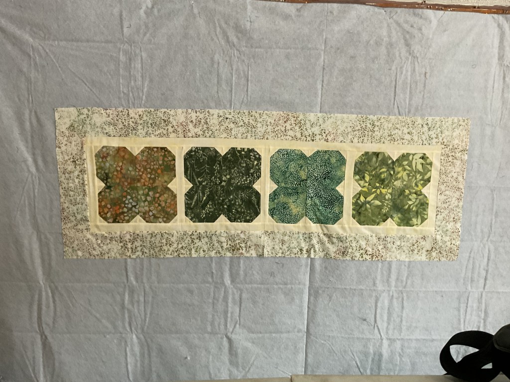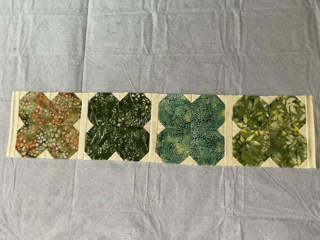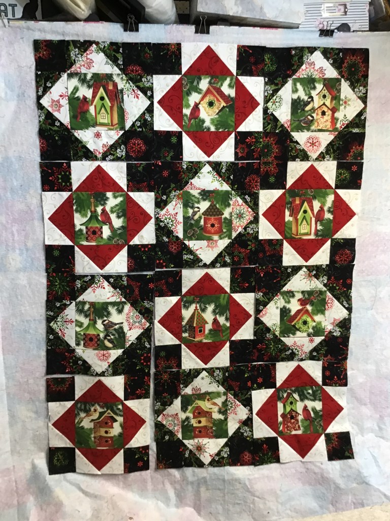Okay, I’m happy with the blocks and outer squares layout, so I’m going to sew my blocks into rows and then sew the rows together.